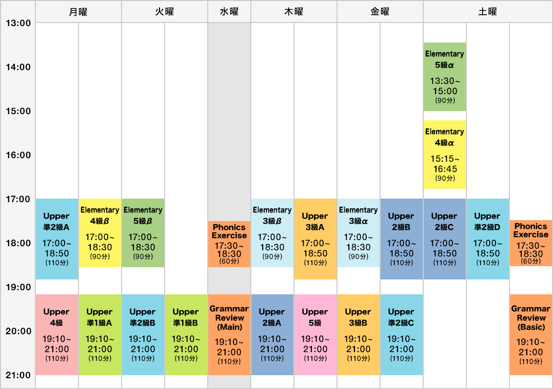 - 英語学習が初めて・初心者の方はElementary5級α/Upper5級のクラスから始めていただきます。